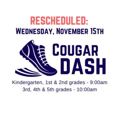 The Cougar DASH is finally here and we hope your students are excited for a fun morning. Our own Cougar, other special guests will be there to cheer them on! You are all more than welcome to come cheer on the children, too. Bring your signs, noisemakers and spirit! Here’s what the morning schedule looks like:
