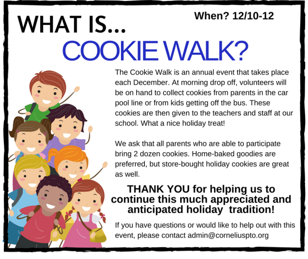Should school be cancelled any of these days, the Cookie Walk will be extended to make up for the days missed (ie: if no school Monday it will extend to Thursday). What a great activity for a cold, snowy (possibly extended) weekend! Get your cookie baking supplies before the weather rolls in!