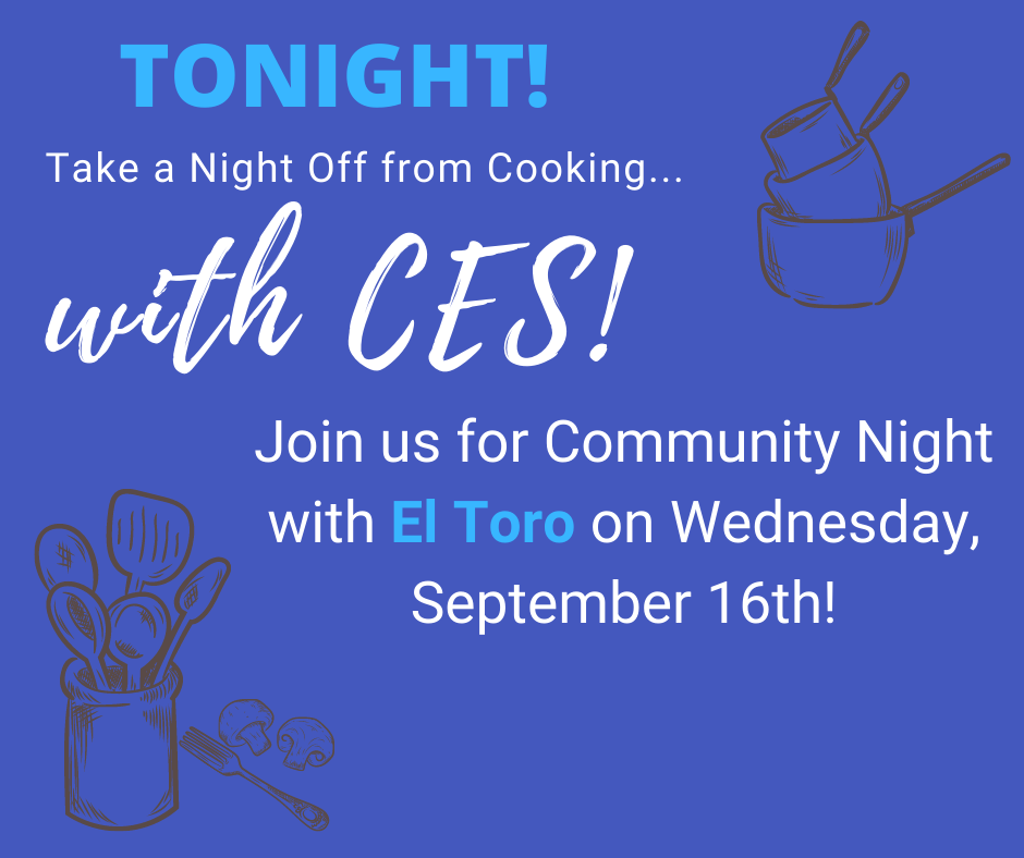 Take a break from the kitchen and head to El Toro tonight! On Wednesday, September 16th from 5-8pm, El Toro will donate a portion of sales to the CES PTO to support our school, teachers and students. Just drop your receipt in the box near the register!