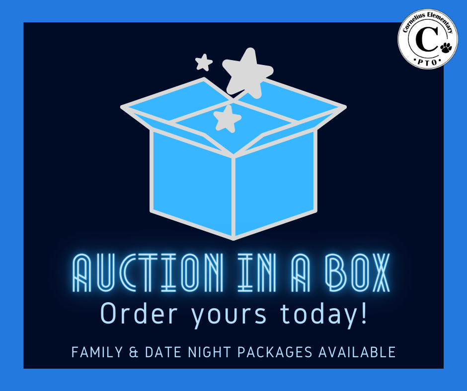 In lieu of tickets this year, the Cornelius PTO is selling Auction in a Box packages for our CES families to enjoy the online auction (beginning October 4th at 10:00am). Friday, September 25th is the last day to order your Auction in a Box at the PTO Online Store! Date Night packages are sold out, but a few Family Night packages remain. All boxes will include $30 of Tenders gift cards for dinner, personalized CES Cougar gifts, and FUN! Pre-order by September 25th for delivery to your doorstep before the auction closes on October 8th.
