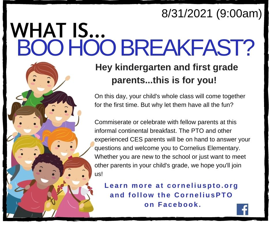 The Boo Hoo Breakfast is a special event for our CES families of kindergarten and first grade students. Please join your CES PTO on the playground at 9:00am. We’ll be ready with high-fives or hugs!