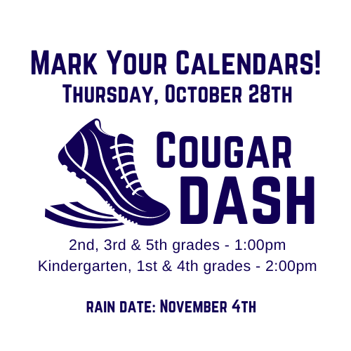 Mark your calendars for one of our coolest fundraisers of the year! The Cougar Dash will take place on Thursday, October 28th. Ahead of the event date, a packet of information will be sent home with each Cornelius student including a pledge sheet. Each Cougar will have the opportunity to win prizes based on their participation and pledges. We invite parents to volunteer at the event, or simply to come out and cheer on your runners! Signs and pom-poms welcome!