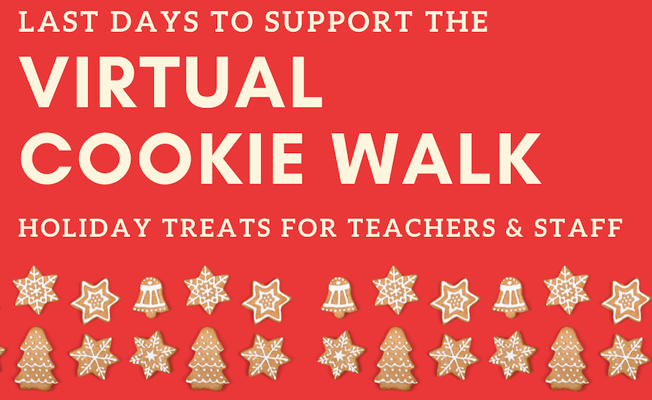 Due to Covid restrictions, the PTO can’t host the annual Cookie Walk this year. Bah-humbug. But don’t worry! Nothing will stop our holiday spirit! In cooperation with Bakery 28, and with your generous donations, the PTO Hospitality Committee will be delivery a beautiful assortment of holiday cookies to each teacher and staff member before winter break. Skip the baking, and visit our websiteto buy a box of cookies, or make a contribution towards the cookie fund. The deadline is December 12th.