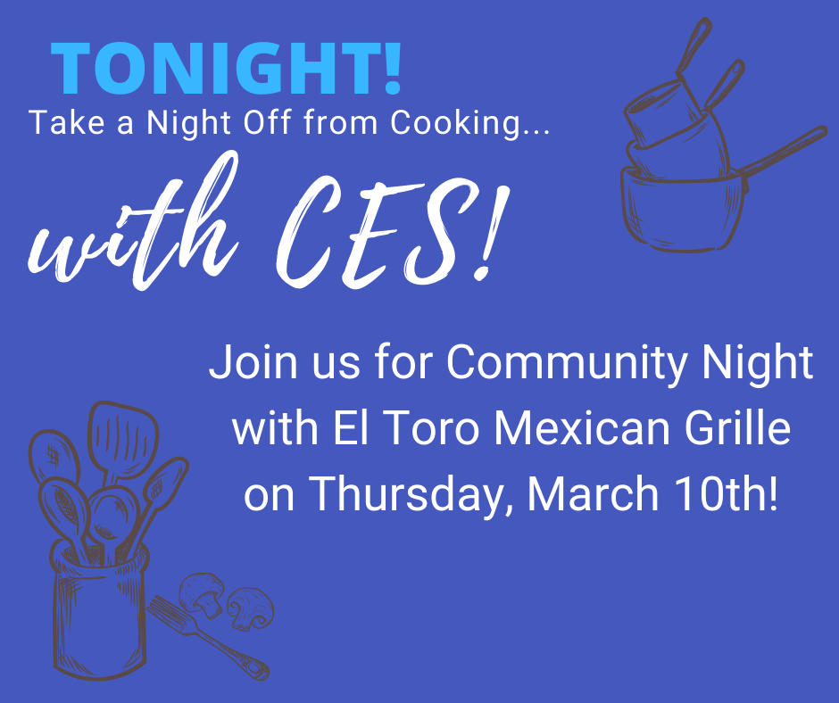 Join the CES PTO in supporting our school with Community Night at El Toro! A portion of sales from lunch and dinner will be donated to the CES PTO. Chips and salsa, here we come!