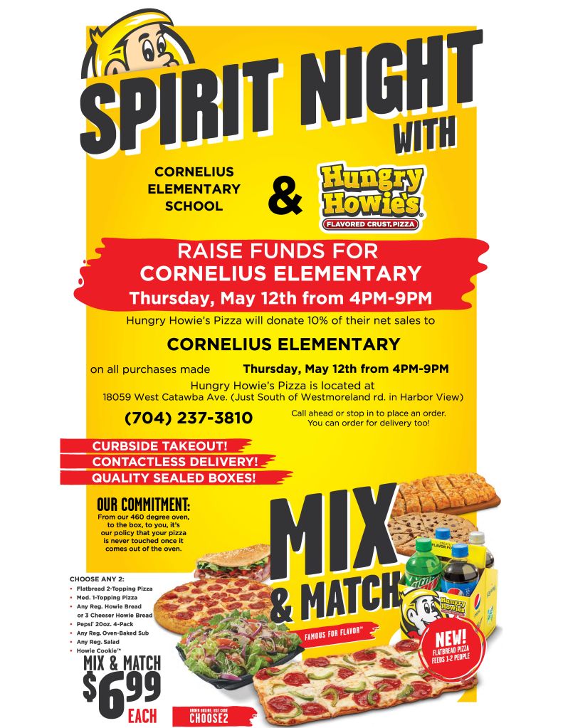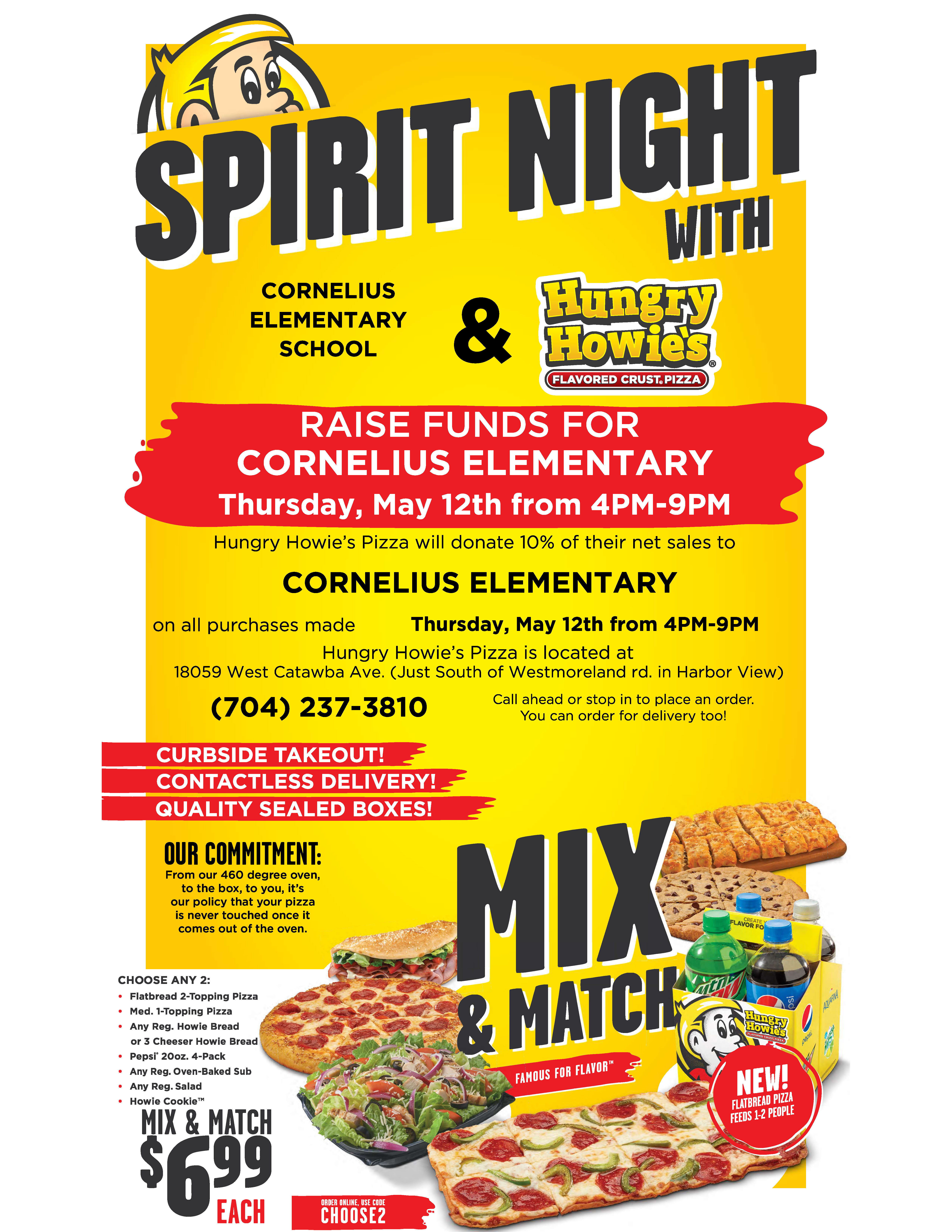 Tonight’s the night! Join us for Hungry Howie’s Spirit Night from 4-9pm. 10% of net sales will be donated back to the Cornelius PTO.