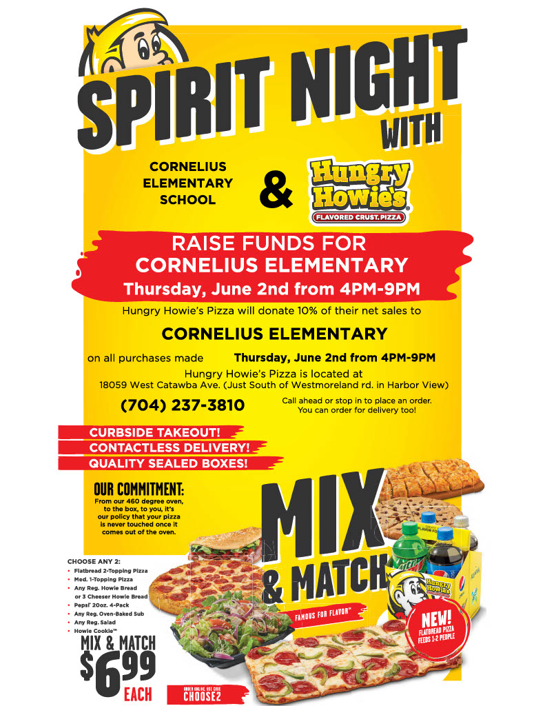 Thursday is the very last Spirit Night of this school year! Hungry Howie’s will donate 10% of their net sales from 4-9pm back to the Cornelius Elementary PTO to support our teachers and students. Go get that Howie Bread!