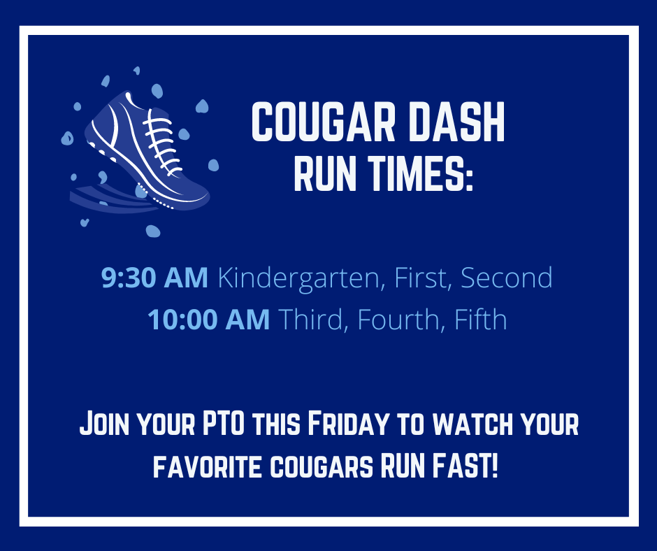Don’t forget, friends and family can join in the fun to support our Cougars at the COUGAR DASH tomorrow, Friday, October 7th! Make signs, bring your cowbell, cheer them on with claps, whistles, and yelling. Don’t forget to check out the run times below, and to make sure you get those donations in!