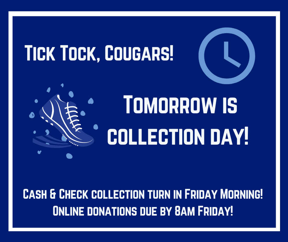 Friday, October 14th is the ONLY collection day for donations for the Cougar Dash! All cash & check donations must be sent in with your student to your teacher this Friday morning to be counted for prize eligibility. Make sure to fill out your blue form and put your name on the outside of your envelope! Final online donations must be submitted by 8:00am on Friday, October 14th.