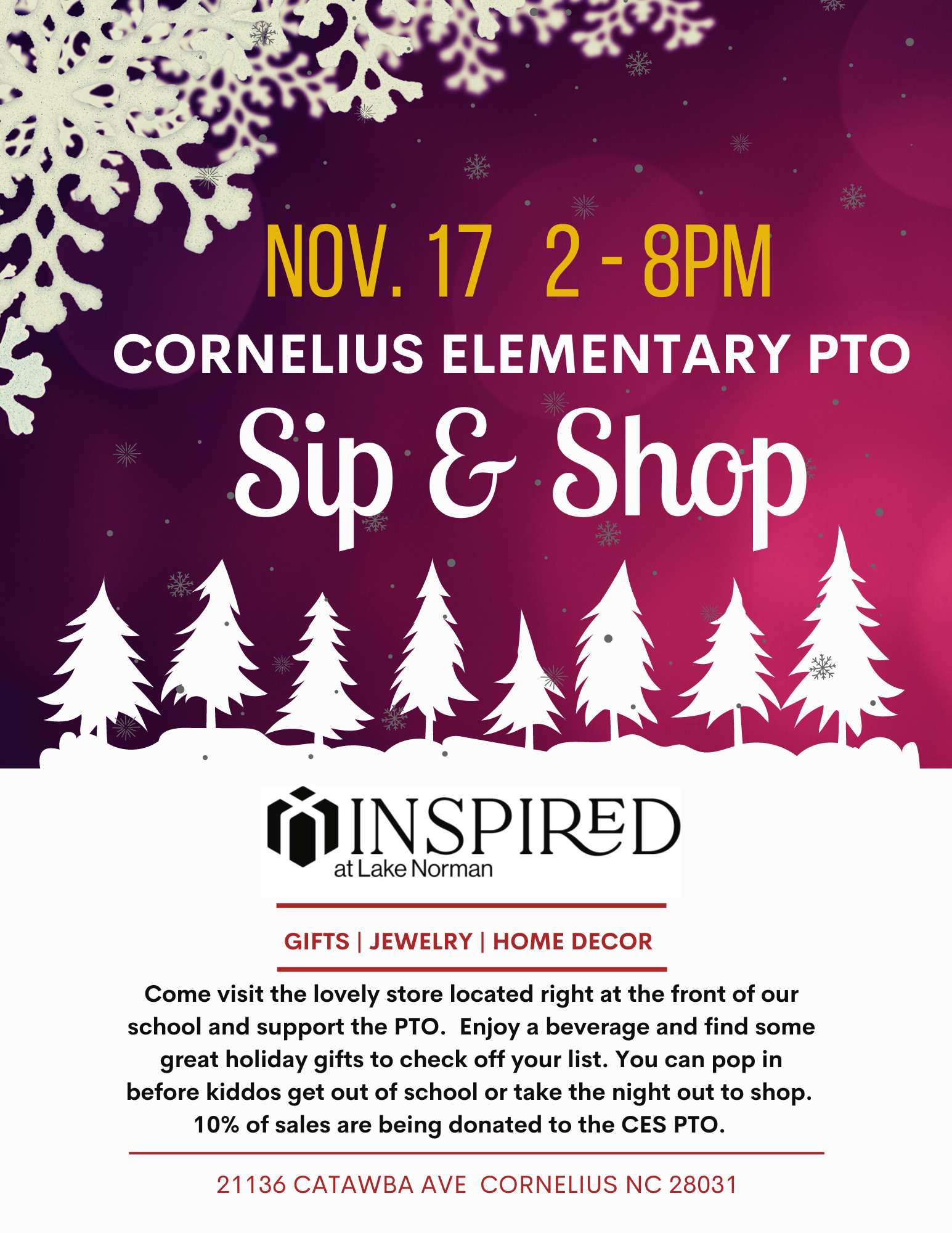 Mark your calendars, Cougar families! Inspired at Lake Norman is hosting a Sip & Shop on Thursday, November 17th. Get an early jump on your holiday shopping, and support CES in the process! 10% of sales between 2pm-8pm will be donated to the CES PTO. Stop by during student pick-up, or make it a night out with friends. We hope to see you there!