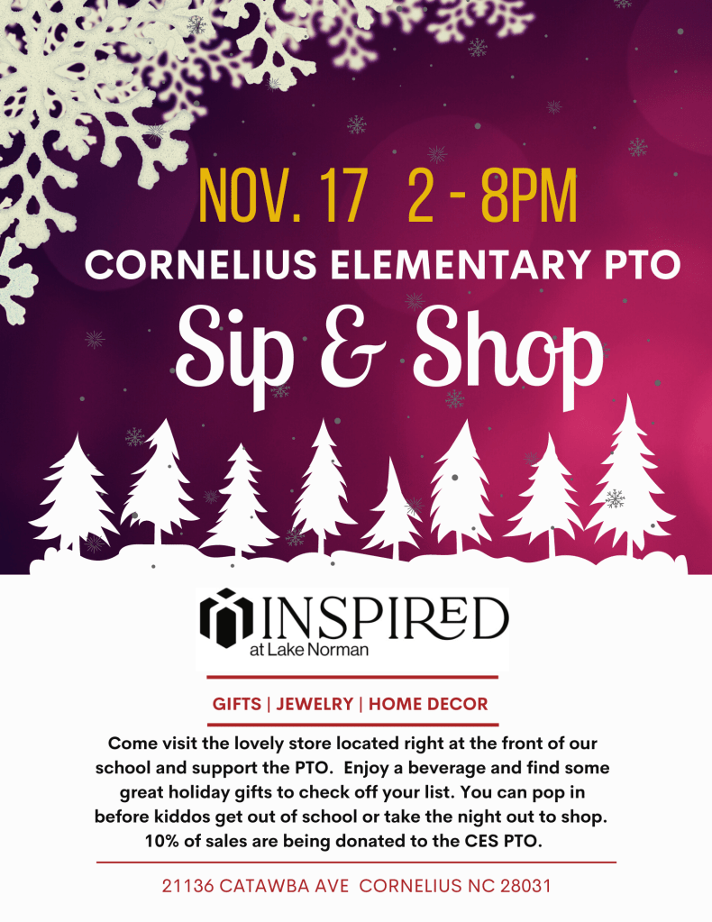 Join us this Thursday, November 17th for our Sip & Shop to support the CES PTO! Inspired at Lake Norman, located right in front of CES, is hosting this shopping experience from 2pm-8pm. You can make a quick stop during student pick-up, or make a night of it with friends! Stop by to shop for gifts, art, and home elements, while you support CES in the process! 10% of sales during the event will be donated to the CES PTO.