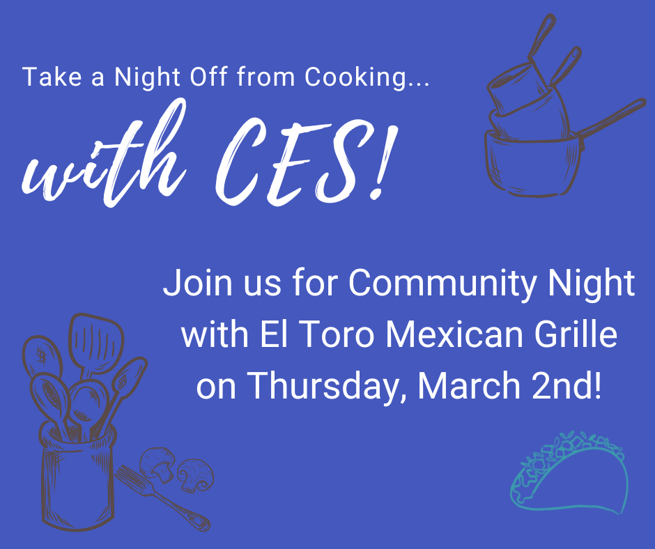 Who’s ready for a PTO Community Night with CES?! Join us Thursday, March 2nd at El Toro for food and friendship. You can take a night off from cooking, have some great Mexican food, and support CES in the process. El Toro will generously be donating a portion of sales to the CES PTO to continue to provide resources, grants and more to our students and teachers at Cornelius Elementary. Don’t forget to order the queso!