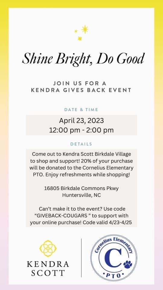 Join us this Sunday, April 23rd from 12-2pm for a Kendra Scott Gives Back event! Visit Kendra Scott Birkdale Village to shop and support CES. 20% of your purchase will be donated to the CES PTO. Don’t have time to make it to the store? Use code “GIVEBACK-COUGARS” to support through your online purchases!