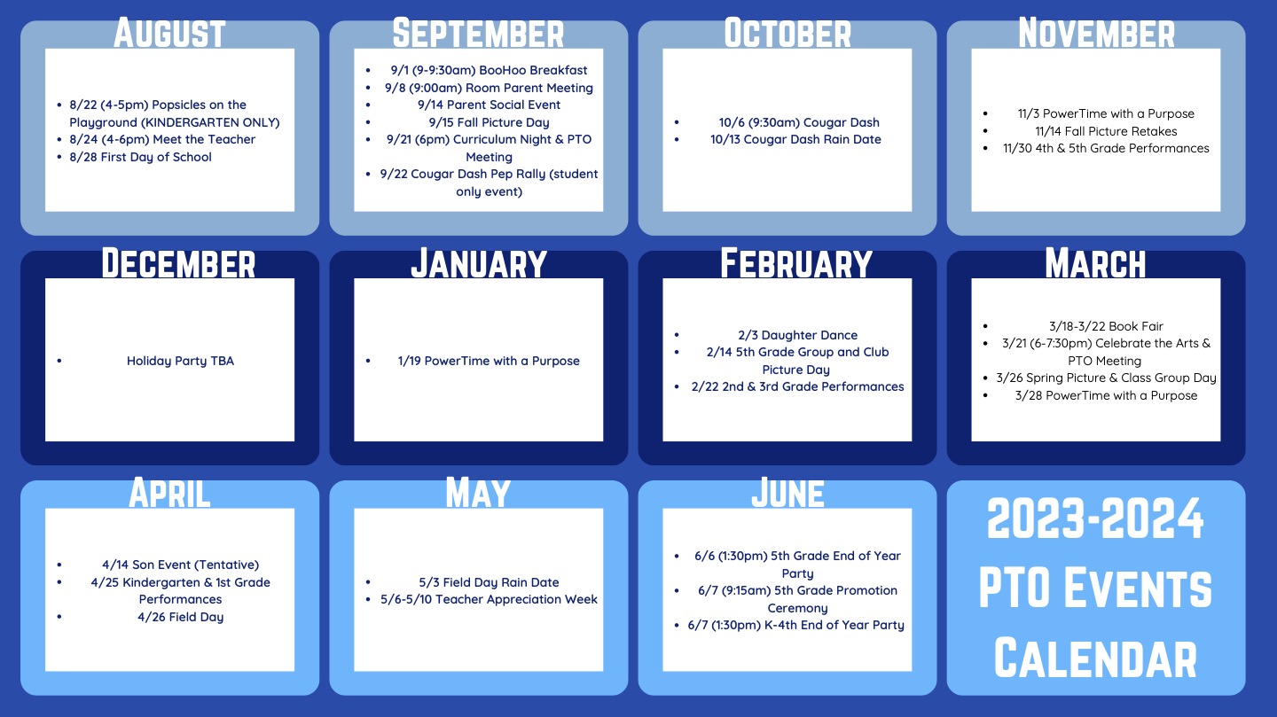 The PTO Events Calendar for the 2023-2024 school year has been finalized! Mark these dates for some pretty cool CES celebrations and occasions!