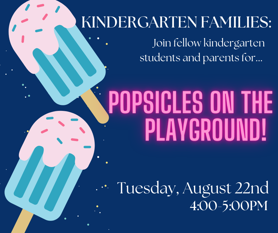 This event is for you, Kindergarten families! Join the CES PTO on Tuesday, August 22nd from 4:00-5:00pm as we host Popsicles on the Playground!