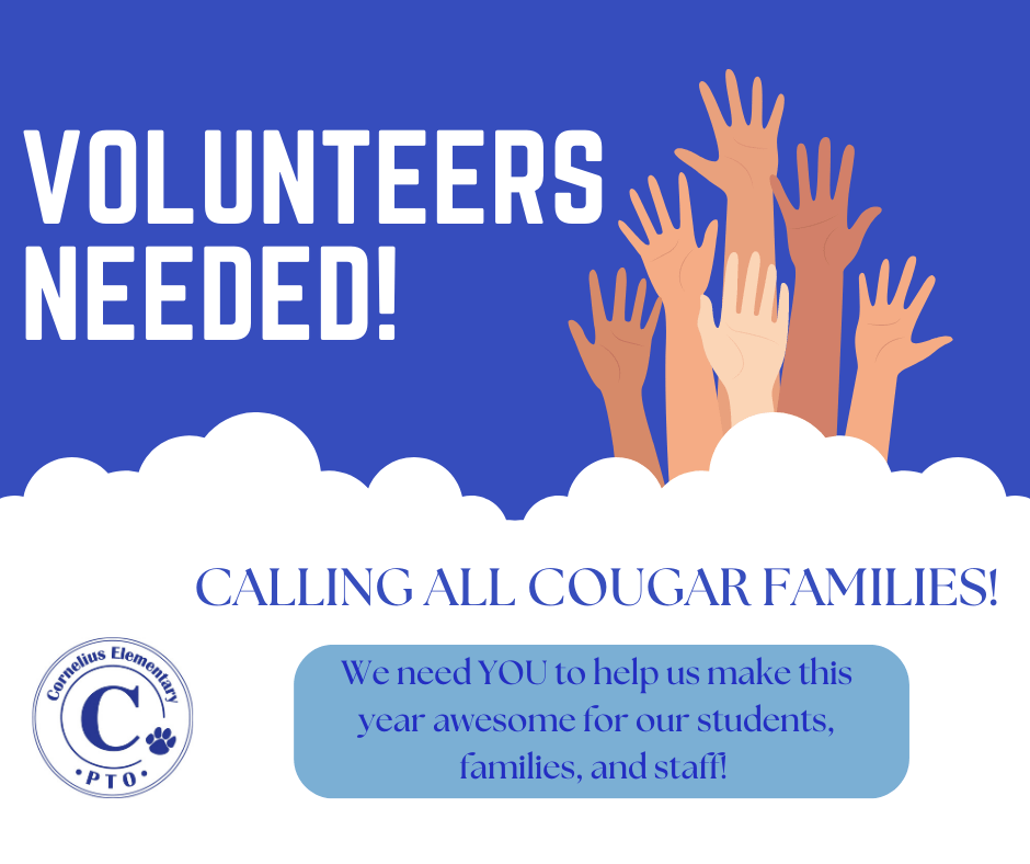 Hey there Cougar families! If you haven’t already, please fill out our volunteer interest form, and let us know how you would like to help out during this school year. It takes a village, and we need you!