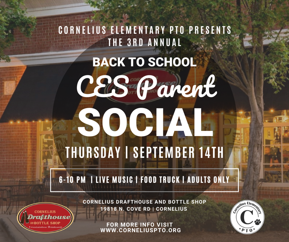 The Cornelius Elementary PTO is proud to host this event for the 3rd year in a row! This is a great opportunity to mingle with the CES Community and enjoy your kid-free night as well. Join us Thursday, September 14th, from 6-10pm at the Cornelius Drafthouse and Bottle Shop, for an evening of fun including live music, a food truck and drinks.