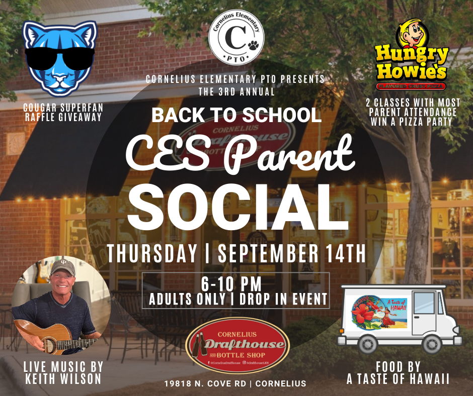 Join us Thursday from 6-10pm at the Cornelius Drafthouse for this adults only event. This is a great opportunity to mingle with other CES parents while enjoying live music by Keith Wilson and great food from the Taste of Hawaii food truck.