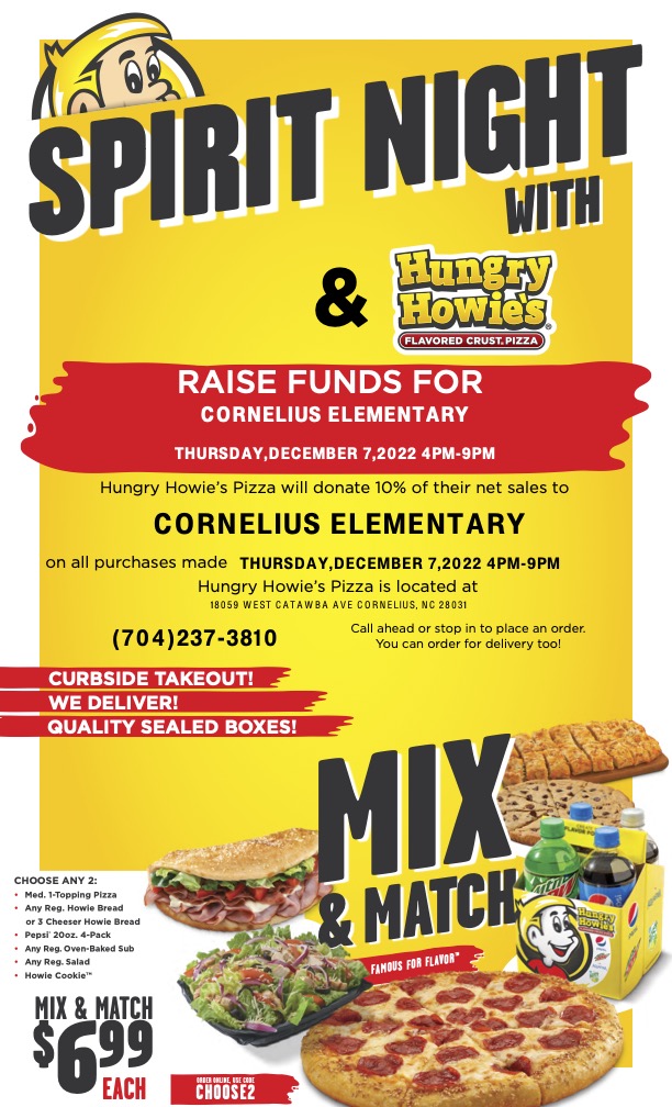 Your Cornelius PTO has big plans for tomorrow, December 7th! Stop by Sip & Shop at Inspired at Lake Norman before picking up dinner at Hungry Howie’s of Cornelius. Both of these local businesses are supporting our wonderful school by donating a portion of their Thursday sales to the CES PTO!