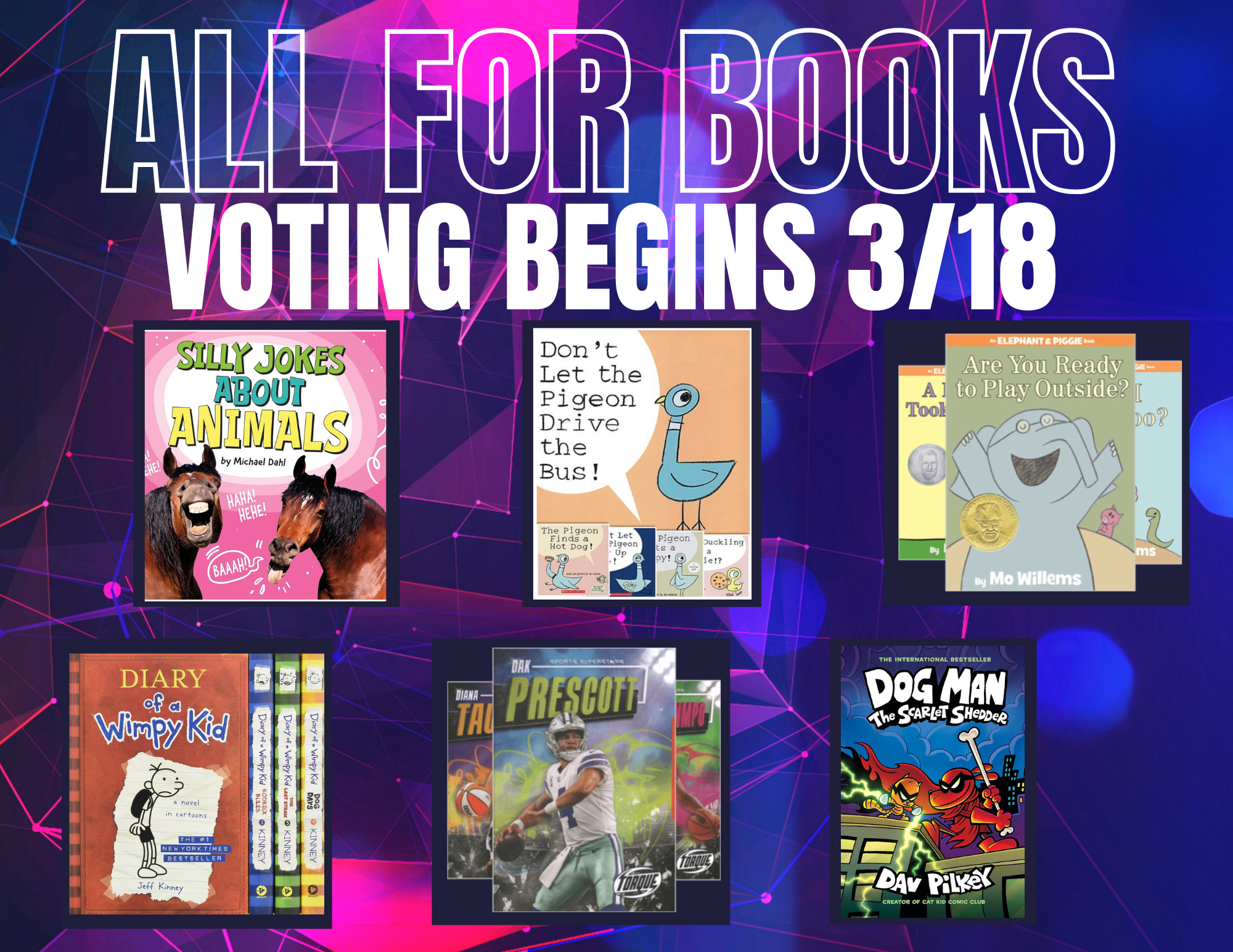 You can help support books for all CES students by donating loose change to our All For Books Collection. All money collected goes to support new books for our library! We will be collecting at carpool drop off and the bus lot. Students can vote for their favorite book collection, and the winning book title will have copies added to the library for students to borrow.