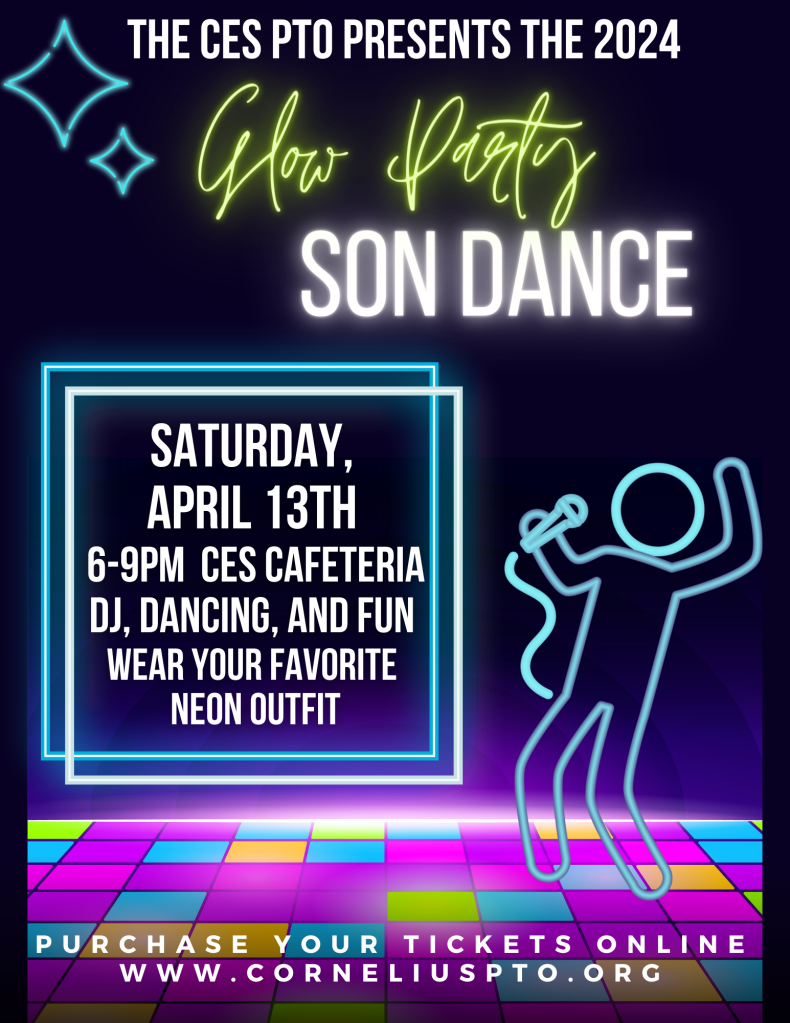 We can’t wait to see you “Glow” as you walk down the halls of Cornelius Elementary on Saturday, April 13th, from 6:00-9:00 PM. Grab some glow sticks and dance the night away to tunes from our favorite DJ. Wear your favorite white or neon clothing and accessories. Light refreshments will be served.