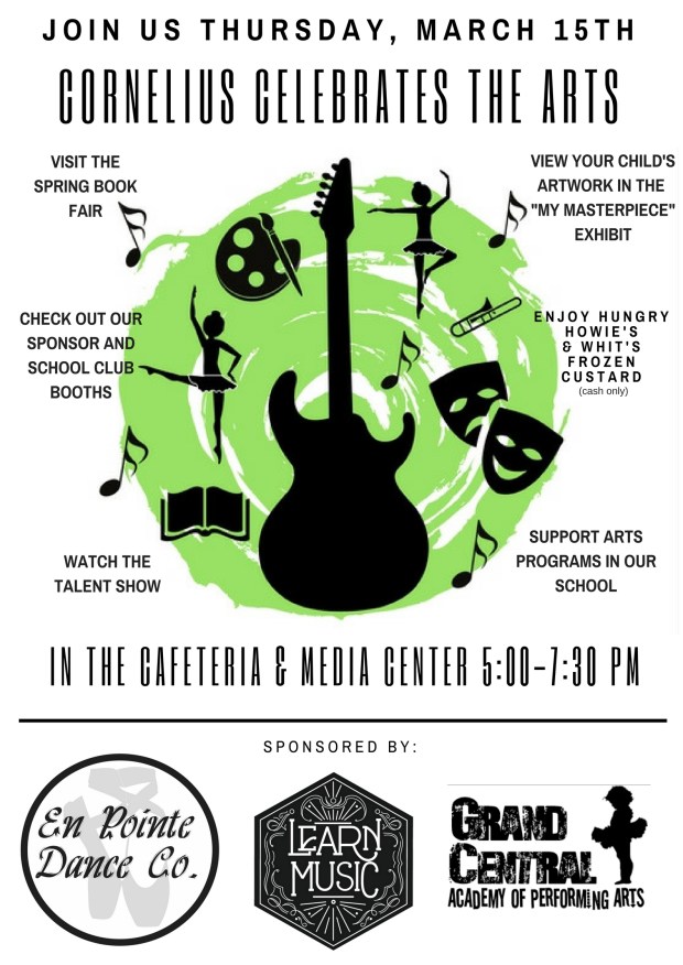 We hope you can join us Thursday, March 15 for Cornelius Celebrates the Arts! This event runs from 5:00-7:30. It kicks off with the student talent show, followed by the 2nd/3rd grade performance. View your child’s artwork in the “My Masterpiece” exhibit, visit the spring book fair, take part in our interactive art activities and visit our sponsor booths for information on ways your child can get involved in the arts. Food will be available for sale from Hungry Howie’s Pizza and Whit’s Frozen Custard. See you there!