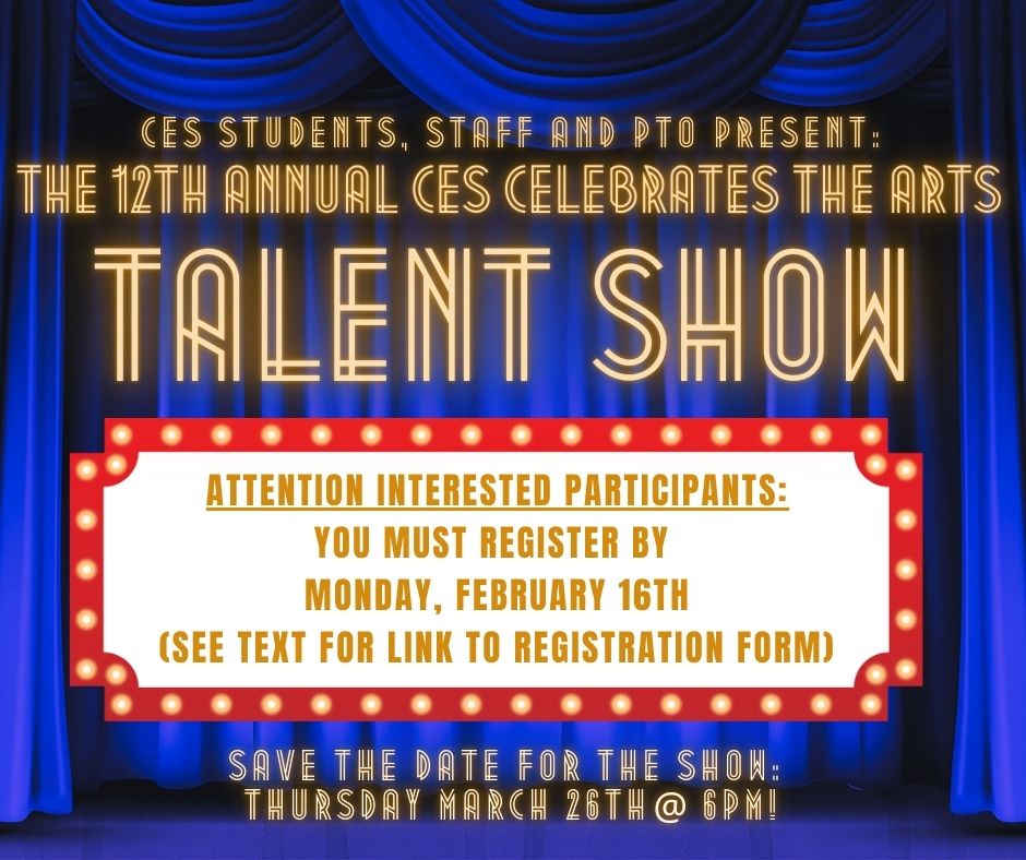 CES Parents & Students we are absolutely thrilled to announce the 12th Annual CES Celebrates the Arts Talent Show to be held Thursday, March 26th!