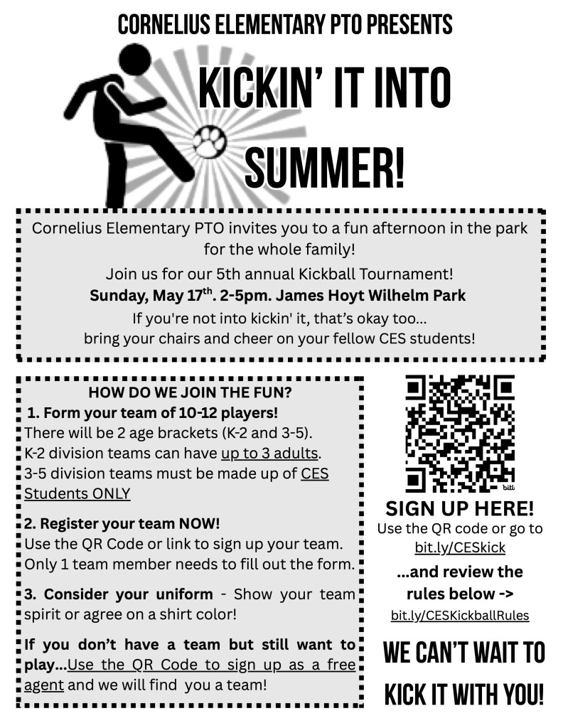 Grab your friends, form a team and join us Sunday, May 17th at James Hoyt Wilhelm Park (the baseball fields behind CES) for our 5th annual Kickball Tournament to close out a great school year!