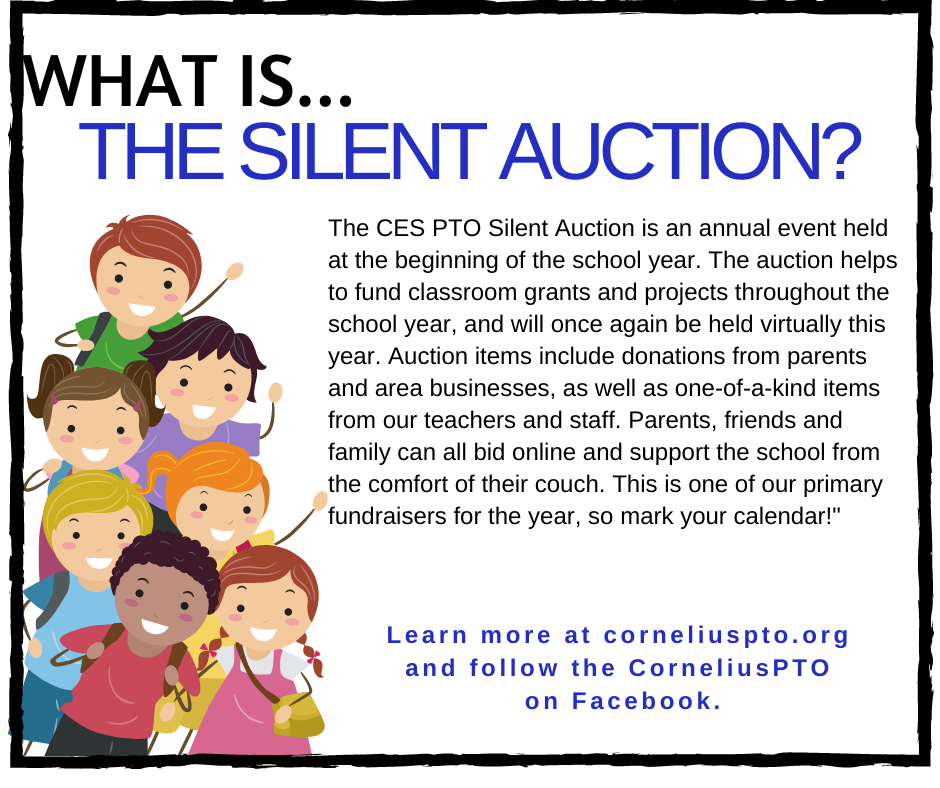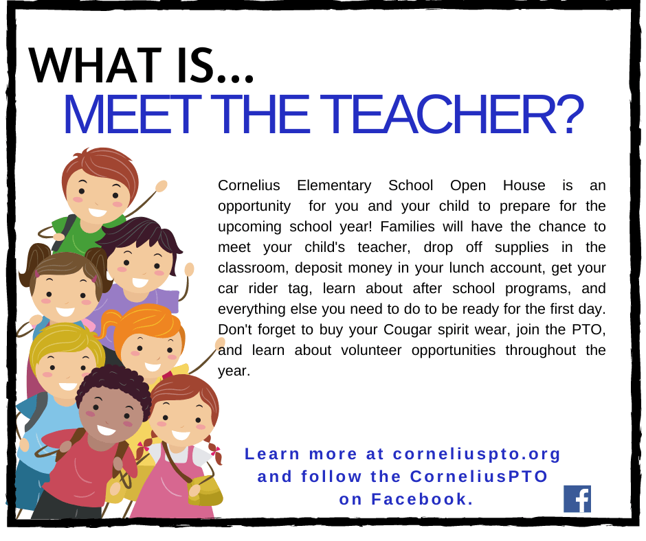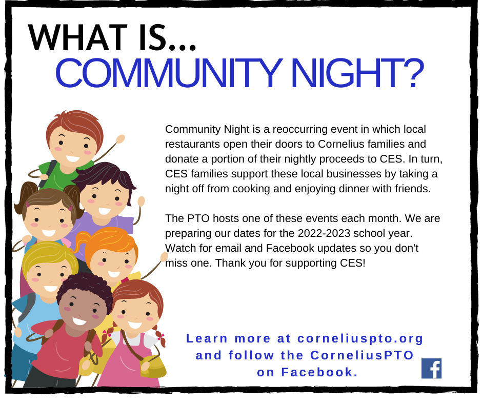 The Cornelius Elementary PTO hosts a number of events for students, as well as parents, throughout the year. While the schedule of events is always growing, we want to give you an idea of what to expect from some of our most popular events. Click the images for a brief description, and visit our PTO Calendar to learn more about dates.